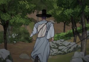Suddenly, Taehyuk awakens, and we all realize that he actually never left the spot he landed when he fell off the cliff. (So what was that whole thing with that dragon lady then?!) He’s trying his damnedest to stay awake, but as Taehyuk passes out, we see a beautiful blue butterfly fly away… and travel through space and time to land on the shoulder of someone wearing traditional Korean clothing. And that someone has Taehyuk’s face.