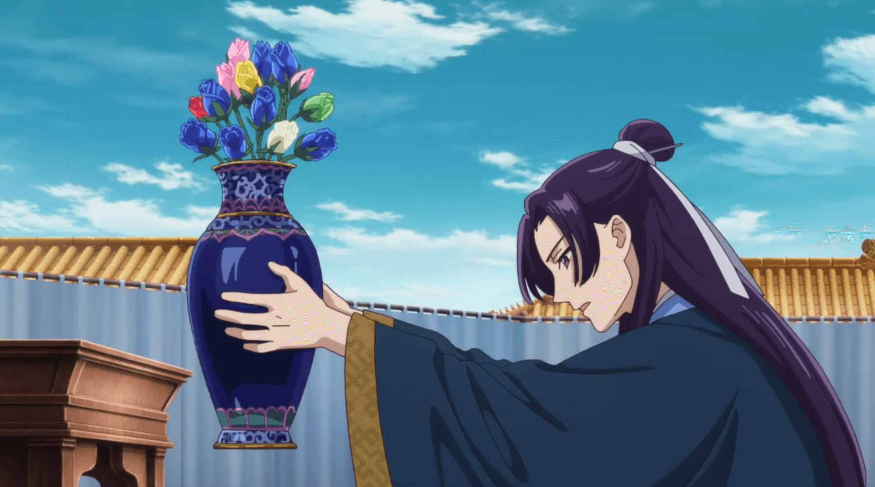 Lakan’s conversation with Jinshi in his office is new to the anime. In the manga, Jinshi appears in front of Maomao one day, asking after blue roses. Of course, he admits who told him about them when Maomao asks, but we never see the actual conversation between Jinshi and Lakan as we do in the show.